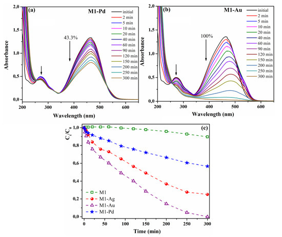 The prepared nanocomposites have potential to be used as photocatalysts with good performance for degradation of some organic pollutants under visible light at ambient temperature due to the surface plasmon resonance effect of the noble metal nanoparticles (Ag, Au, Pd) embedded in polymeric films together with ZnO NPs [13,45,46]. In the literature, hybrid composites bearing ZnO and noble metal NPs are reported, with good results for photocatalytic degradation of organic pollutants under visible light [45,46,47]. However, up to now, there are only few studies concerning the use of ZnO and noble metal NPs/polymer systems in photocatalysis, especially in visible domain [13,48], despite the great advantages of these catalytic materials such as easy recovery and reusability. First, the photocatalytic performance of our composite films (M1, M1-Ag, M1-Au and M1-Pd) was evaluated in the decomposition of an organic dye, namely methyl orange (MO), under visible light irradiation. The MO aqueous solution (5 × 10−5 M) subjected to the above conditions was analysed through UV-vis spectroscopy, technique appropriate for the nanocatalysis field to monitor the reaction kinetics [49]. A blank experiment was also realized, the pure MO solution in the absence of the photocatalyst was subjected to visible light irradiation for 300 min, the degradation degree attained being 6.2% (Table 2), which was assigned to MO photolysis, not decomposition.