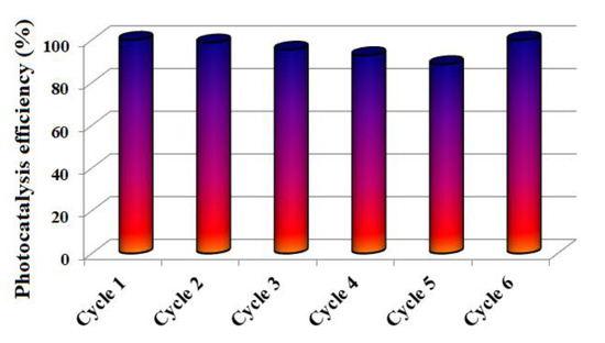 The photocatalyst reusability is a very important aspect for practical applications and therefore, in the next experiments, the M1-Au composite was used for methyl-orange photodegradation for six cycles and the obtained results are presented in Figure 10.