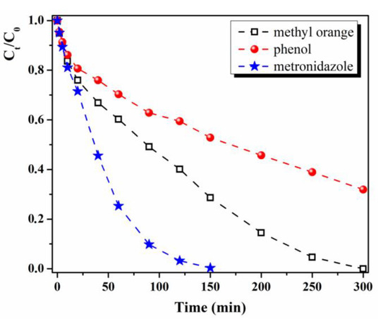 Additionally, the M1-Au hybrid composite was tested as photocatalyst (in visible light) for the degradation of other types of pollutants which are often found in wastewater, namely phenolic derivatives (phenol) and pharmaceutical compounds (metronidazole). Very good results were obtained in the decomposition of metronidazole, which is completely photodegraded after only 150 min of exposure to visible light in the presence of M1-Au hybrid material (Figure 11), with a constant rate k = 31.53 × 10−3 min−1.