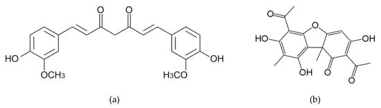 Usnic acid (Figure 1b) from the species of Usnea, Cladonia, Parmelia, Ramalina, Lecanora, Evernia, Thamnolias, and other lichens also comes into notice due to unique properties similar to curcumin [31,32,33]. Interestingly, usnic acid possesses antimalarial [34] and antituberculosis activity [33].