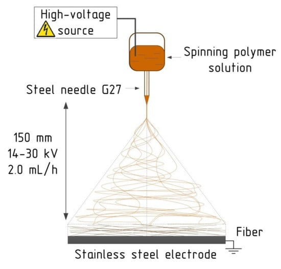 Fiber formation was performed by utilizing the electrospinning system NANON-01A (MECC CO., LTD., Fukuoka, Japan). The principal scheme of the electrospinning process is demonstrated in Figure 2 and was considered in detail earlier [3].