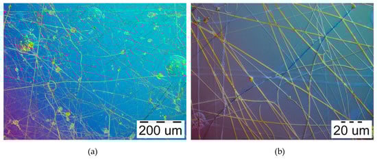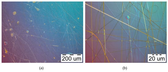 Microphotographs of curcumin/usnic acid-loaded hyaluronic acid fibers electrospun from the polymer solutions under 22 kV: (a) magnification 100×; (b) magnification 1000×.