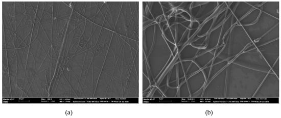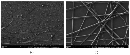SEM images of curcumin/usnic acid-loaded hyaluronic acid fibers electrospun from the polymer solutions under 22 kV: (a) magnification 1000×; (b) magnification 10,000×.