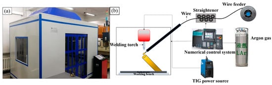 (a) Overview of wire arc additive manufacturing equipment; (b) schematic diagram of wire arc additive manufacturing process.