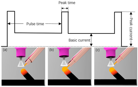 Compared with existing AM methods, WAAM is an arc welding process based on tungsten inert gas arc welding (TIG). The arc formed between a pointed tungsten electrode and a substrate in an inert atmosphere of argon is used as the heat source. The arc current is pulsating in a direct current, and its waveform is shown in Figure 2. As shown in Figure 2b, the wire is melted and forms a liquid weld metal drop adhering to the wire in the base current period. While in the peak current period, the molten pool is transferred from the welding wire to the layer under the influence of droplet impact, arc power and gravity. Then the molten pool solidifies quickly within the base current time of the next pulse cycle, and the next wire is melted in this period, thus repeating the cycle. Through repeated spot-welding processes, rods can be formed.