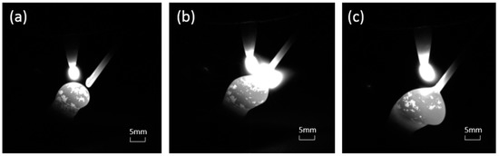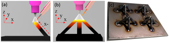 After completing the manufacturing of a single rod, we need to move the welding gun and complete the manufacturing of the remaining three rods in the same way, as shown in Figure 3a,b. In this process, we need to determine the manufacturing sequence of the inclined rods according to whether there is any interference in space. Because the wire feed tube is on the right side of the welding gun, the printing sequence can be as follows: X−, Y−, X+, and Y+. Figure 3c shows the sample manufactured by this process. The three images shown in Figure 4 were captured by a CCD camera (avA1900-50gm, Basler, Ahrensburg, Germany), which show the deposition process visually.