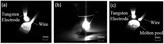 where U is the average voltage of the TIG welding, Iav is the average current, Tm is the torch moving speed, Ip is the peak current, Ib is the base current, Tp is the peak time, Tb is the base current duration and η is the arc conversion efficiency (assumed to be 0.7). Additionally, during the whole process, we use argon gas with a purity of 99.99% as the shielding gas, and the gas flow rate was 20 L/min. On the basis of a large amount of experimental experience in the early stage, we generally set the distance between the tungsten electrode and the substrate to 8 mm, and the distance between the tungsten electrode and the feed wire to 6 mm, which can ensure stable arc starting and arc impact.