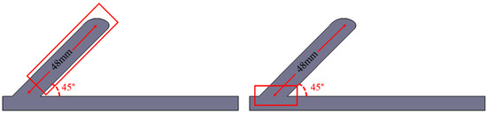 Due to the heat dissipation effect of the substrate, the temperature of the droplets closer to the substrate is lower, and the surface tension γl−g of the molten pool is larger, resulting in the increase of the contact angle θ, the smaller diameter and the higher actual layer height. Figure 10 is the schematic diagram of the relationship between the spread of the molten pool and the contact angle. The movement of the welding torch is controlled by a pre-written G code. In the X+ direction, the movement code is X+ 0.5, Z+ 0.5. Therefore, the next drop of the molten pool will be inserted into the previous drop, and under the action of large surface tension, it will shrink to the previous molten pool. After a few layers, the heat dissipation effect of the substrate on the molten pool is gradually weakened. Then the rod can be built at the set 45°. As Figure 7c shows, when the preset layer height is 0.55 mm, there will be a lot of unmelted wire on the back of the rod, but no unmelted metal wires on the side of the rod near the arc. This is different from the unmelted wires caused by low heat input, that were shown in Figure 11c. As shown in schematic Figure 12, when the layer height is too high, the wire cannot stick in the molten pool and complete the lap. Then the wire easily penetrates through the welding arc column area, and is burned in sections, which also interferes with the arc voltage, causing the arc length to be disordered and affecting the continuous forming of the rod. The wire near the side of the arc will melt under the action of the arc. The last group was to set the height of the first five layers: to 0.55 mm, and then to 0.5 mm. As is shown in Figure 7d, the part of the rod closest to the substrate did not show the phenomenon shown in Figure 7b, but grew in the set 45° direction According to the above-mentioned analysis, we know that the preset layer height should be strictly controlled to match the actual layer height. Only when the displacement of the welding gun in the Z direction per unit of time is equal to the height of the molten pool can the deposition be carried out stably, and we can get a good formed rod.