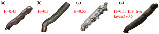 Four typical rods with different preset layer height; (a) the typical sample morphology with 0.45 mm preset layer height; (b) the typical sample morphology with 0.5 mm preset layer height; (c) the typical sample morphology with 0.55 mm preset layer height; (d) the typical sample morphology with 0.55 mm preset layer height in the first five layers, which then becomes 0.5 mm.