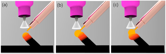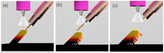 Schematic of manufacturing process with too-high layer height. (a) wire feeding; (b) Lap failure; (c) Peak current knocks down the wire.