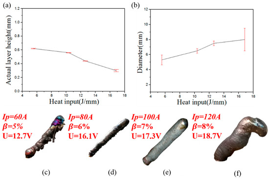 (a) Relationship between heat input and actual layer size; (b) Relationship between heat input and diameter; (c) Typical sample morphology in group I; (d) Typical sample morphology in group II; (e) Typical sample morphology in group III; (f) Typical sample morphology in group IV.