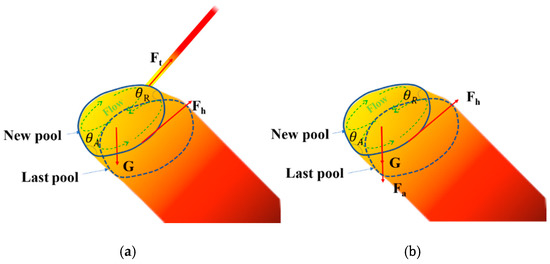 As can be seen from Figure 11, the fabrication of stable rod shapes depends on the heat input Q. The actual layer height decreases with the pace of increased heat input, while the diameter increases with the increase in heat input. Four typical types of inclined rods appeared under different heat conditions in Figure 11. As is shown in Figure 11c, when the heat input is low, that is, Q < 5.53 J/mm, the wire material cannot melt completely, and adhesion is caused. The diameter is about 5.24 mm, which is related to the stress condition of molten pool. As is showed in Figure 13, the force of the molten pool can be divided into dispersion force and coupling force. The main dispersion force is the welding arc force Fa and gravity of the molten pool liquid metal G [29], while the main coupling force is the surface tension Ft. Different from the contact angle model in Figure 10, θA is greater than θR. The difference between θA and θR is called contact angle hysteresis, and the hysteresis force Fh is produced due to the existence of contact angle hysteresis. The hysteresis force is equal to Ftω × (cosθR − cosθA) [29]. Here, ω is the width of the droplet. The arc force Fa is mainly related to the current, voltage and pulse frequency. When the heat input is low, which refers to the peak current and peak time, the Fa is too small to transfer the droplet from the metal wire, resulting in the adhesion and small diameter. As the heat input increases, the arc force Fa becomes larger. In the same volume of molten pool, the molten pool is more impacted and the diameter will be greater, which is consistent with the experimental results in Figure 11. When the heat input Q > 16.83 J/mm, the molten pool cannot yet solidify before the new molten pool arrives, and it will collapse, for the gravity G exceeds the hysteresis Fh.