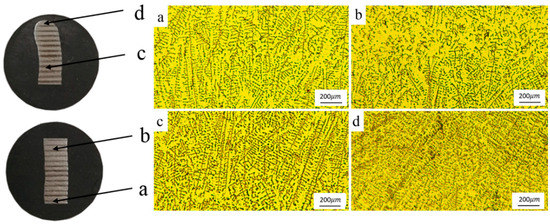 Figure 14 shows the longitudinal section of the inclined rods and the microstructure. From the top of the rod to the substrate, four regions were selected for observation of their characteristics. We can clearly see the layer bands showing that the inclined rod is formed by the layer solidification of droplets. Zone a is a transitional area, and we can see from Figure 14a that there is a lot of austenite and a little ferrite in this area. Because this area is close to the substrate and the substrate has strong heat dissipation, the solidification speed of the droplets and the cooling rate of the solid phase transformation are very fast. When the ferrite is transformed into austenite, the compositions of Cr, Ni and other alloys at the ferrite–austenite grain boundary cannot fully diffuse, and the composition segregation is serious, resulting in the supercooling of the composition and less ferrite transformation. Zone b is the fusion zone between the coating layers, in which the microstructure is shown as a columnar austenite crystal with residual linear ferrite at its grain boundary. During the solidification of the liquid metal in the cladding layer, because the heat dissipation is the fastest in the direction perpendicular to the fusion line, the temperature gradient is larger and the undercooling is larger. Columnar ferrite grows along the direction perpendicular to the fusion line, and the columnar ferrite changes into columnar austenite and residual linear ferrite with the decrease in temperature. As the distance from the fusion line increases, the supercooling decreases and the component supercooling increases. The ferrite dendrites grow in the liquid–solid phase transition, and the residual dendrites are obtained in the solid phase transition. Zone c shows the stable regions where the heat dissipation of the substrate has no effect on tissue transformation; we found that in these regions, the grains appear as larger austenite grains and continuous dendritic residual ferrite. Zone d is the last layer, and its latter layers undergo no heat treatment, as compared to previous layers, which is in line with Figure 14d, which shows there are more ferrites in this layer.
