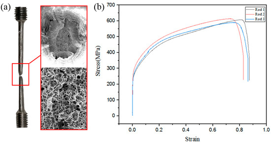 (a) Morphology of broken sample and SEM images of fracture surface; (b) Stress–strain curve of the tensile specimens.