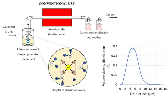 - Majerič, P.; Jenko, D.; Friedrich, B.; Rudolf, R. Formation mechanisms for gold nanoparticles in a redesigned Ultrasonic Spray Pyrolysis. Adv. Powder Technol. 2017, 28, 876–883. [Google Scholar] [CrossRef]