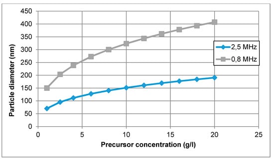 The size of the obtained nanoparticles is related to the droplet diameter and the initial concentration of the precursor solution. Increasing the ultrasonic frequency reduces the droplet diameter of the produced aerosol, and also increases the ratio of smaller nanoparticles in the final product. The formation of droplets by ultrasound was first described by Wood and Loomis in 1927 [49]. In 1962, Lang formulated an equation to describe the connection between the ultrasonic frequency and the mean droplet diameter [50]. A theoretical equation for the prediction of sizes of obtained nanoparticles was formed in previous work [51], combining Kelvin’s equation and an equation based on the capillary theory.
