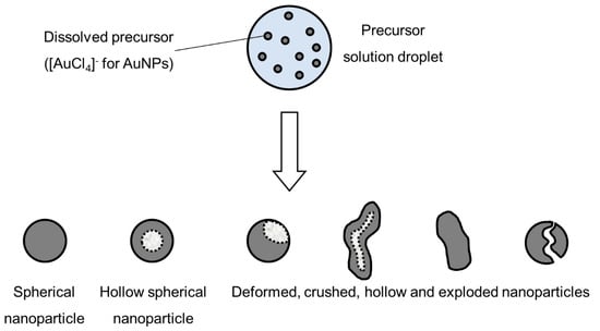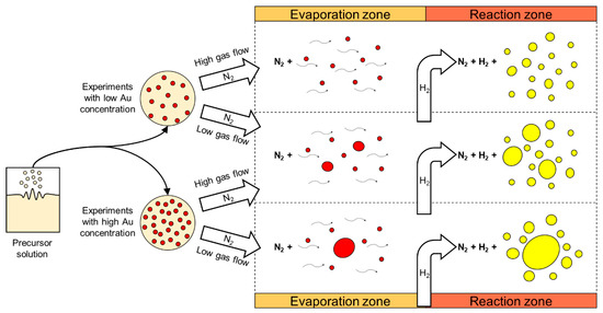 Practical formation model of AuNP synthesis in the modified USP. The typical morphologies are shown using high or low Au concentration in the precursor solution and high or low gas flow in the USP device. Adapted from [59].
