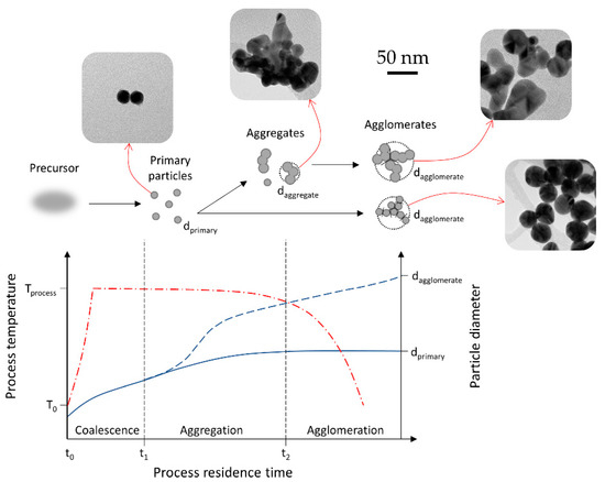 In order to obtain uniform nanoparticles with such highly volatile precursors, a balancing act is needed between the physical events of the aerosol, governed by the USP parameters, and the chemistry of the used formulations. A helpful representation of the effect of these parameters on the particle growth and morphology is the residence time of the aerosol particles in the reaction furnace, as shown in Figure 9. Initially, primary particles are formed from the precursor. These particles may then be joined closely to each other by chemical forces (covalent, ionic), forming necks and hard agglomerates or aggregates, which are difficult to break apart into primary particles. Soft agglomerates (simply called agglomerates) are composed of loosely attached primary particles or aggregates by physical forces (electrostatic, van der Waals), and can be dispersed into individual elements by applying force or energy (e.g., ultrasound) [10]. The length of each particle growth stage or how long the residence time of the particles is in each stage of coalescence, aggregation, or agglomeration, determines the final particle morphology.