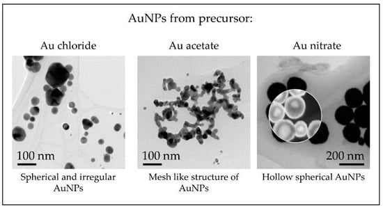 Solid phase metal acetate precursors, such as Au (III) acetate, Au(O2CCH3)3), have shown great potential to expand the composition and structures of nanoparticles. Gold acetate was always readily available, even though its low solubility in most solvents limits its use in the synthesis of AuNPs [17,60].