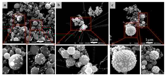 SEM images of the produced Ag/TiO2 nanoparticles, adapted from [36], (a) Ag content 20 wt.% with a reaction temperature of 800 °C, (b) Ag content 40 wt.% with a reaction temperature of 800 °C, (c) Ag content 40 wt.% with a reaction temperature of 1000 °C.