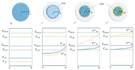 The liquid-to-solid and solid-to-solid conversion processes with USP can be described with the DTP mechanism. This mechanism, in general, consists of the formation of droplets, transportation of these droplets into a heating zone, evaporation of the solvent and thermal conversion of the solute into the final nanoparticles. As the droplet with dissolved material is being evaporated it shrinks, and, simultaneously, increases the mass fraction of the solute inside the droplet. The solute can begin to precipitate before uniform saturation is reached across the droplet because the solute diffusion is slower than the evaporation of the solvent. As the solid material is being precipitated on the droplet surface due to supersaturation, the liquid can become trapped in the centre. It then begins to evaporate through the newly formed surface crust (Figure 4). This slows down the evaporation rate.