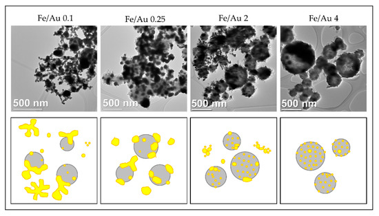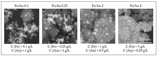 - Majerič, P.; Feizpour, D.; Friedrich, B.; Jelen, Ž.; Anžel, I.; Rudolf, R. Morphology of Composite Fe@Au Submicron Particles, Produced with Ultrasonic Spray Pyrolysis and Potential for Synthesis of Fe@Au Core–Shell Particles. Materials 2019, 12, 3326. [Google Scholar] [CrossRef] [PubMed]