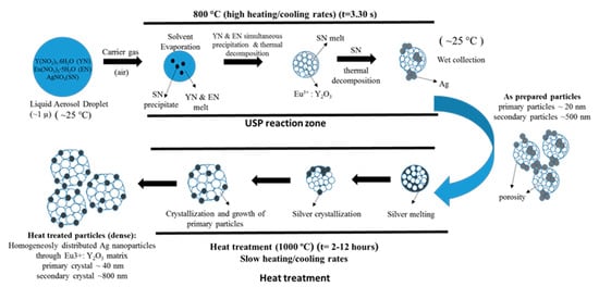 Currently, there is a need for scaled-up production of nanoparticles, able to take up the increasing quantities of nanoparticles required for advanced applications. Technologies for generating nanoparticle powders and suspensions have existed for several decades [15], and are being improved upon continually, while novel approaches are also being studied [16,17]. One potentially reliable method for the large scale synthesis of nanoparticles is the USP process [18]. This process is considered to be relatively cost-effective, and easily scalable from the laboratory to an industrial level. Several different types of nanoparticles and structures can also be produced by USP, such as solid or hollow nanoparticles, core–shell and ball-in-ball structures, etc. [4,19,20,21,22], giving an additional advantage to this production method. Yolk–shell-structured [23,24], mesoporous [25] and multicomponent composite particles [26,27] were also proven to be synthesised with this method, by a group focusing on Li-ion and Na-ion battery applications of these particles. Depending on the particle composition, the formation of mesoporous or multicomponent structures can also be facilitated with subsequent processing of the initial particles produced by USP. The process is also used extensively for thin film deposition [21,28], with multiple layers [29]. The latest scientific finding reported [30] that a fully solution-based fabrication process exploiting USP and spin coating techniques, owing to their simplicity, high degree of freedom for mixing metal oxide precursor salts, and larger area deposition, opens the potential application of solution-processed transistors for low-cost electronic devices.