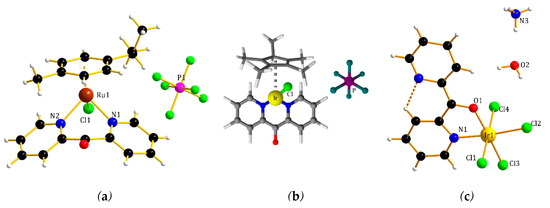 As mentioned in the introduction, di-2-pyridylketone adopts a variety of coordination modes, which is demonstrated in the structure of the obtained complexes. In complex 1, the py2CO-donor binds to the Ru(II) ion in a bidentate manner (κ2N,N’). The pseudo-octahedral geometry of the half-sandwich complex is completed by the p-cymene moiety and a chlorido ligand (Figure 1a).