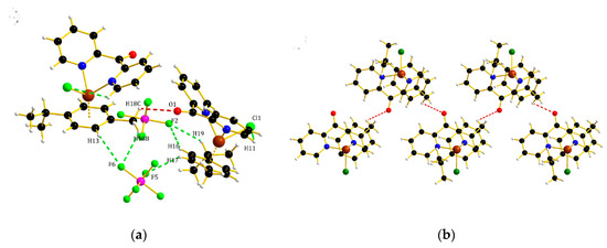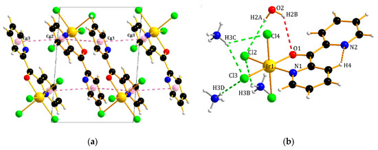 Unfortunately, using the same protocol for the preparation of crystals for 2, we were unable to obtain proper monocrystals for X-ray measurement. However, comparative analysis of the 15N NMR data and FTIR spectra confirmed the same coordination mode of the py2CO ligand in the suggested [(η5-Cp)IrCl(py2CO)]PF6 (2) complex. On the other hand, we noticed in the molecular structure of 3 a rare chelating κ2N,O coordination mode. Such coordination is caused by the formation of a strong intramolecular C(4)–H(4)···N(2) hydrogen bond owing to the rotation of the C6–C7 bond connected with the uncoordinated pyridine fragment (Figure 1c). The double bond character of the C=O group of the py2CO ligand in 3 is confirmed by its proper bond length (1.2828(13) Å), which is typical for the C=O bond, being in a range of 1.21–1.23 Å [22]). In addition, the coordination sphere of Ir(III) with a distorted octahedral geometry is completed by four Cl− ligands. The structural parameters in the neutral fragment are normal compared with those in the IRIM and ICR-type complexes [23,24]. The lengths of the Ir–Cl bonds are in the range 2.329(2)–2.354(2) Å, while the lengths of the bonds with nitrogen and oxygen donors are significantly shorter and reach Ir(1)–N(1) 1.998(7) Å and Ir(1)–O(1) 2.053(6) Å, respectively. The deviation from the ideal angles in the coordination sphere of Ir(III) is 9.4° in the case of the formation of a six-membered chelate ring by organic ligand N(1)-Ir(1)-O(1) 79.2(2) (Table 2). The molecules of 3 are stabilized in the crystal structure through proper arrangement of hydrogen bonds, such as N–H···O, N–H···Cl, O–H···O, and C–H···N, along with π···π interactions (Figure 3 and Table 3). Two symmetry-related layer structures are stacked in a slipped face-to-face mode and contacted through π···π (Cg1···Cg2 distance of 3.8043(9) Å and Cg1···Cg3 distance of 3.7387(10) Å) interactions to form a double layer (Figure 3a).