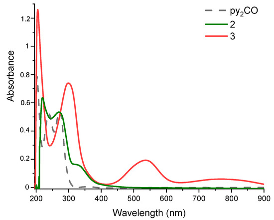 UV-Vis spectra for 2 and 3 (solid) along with py2CO (dashed) in ethyl acetate.