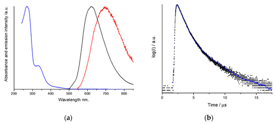(a) Band profile of UV-Vis absorption spectrum for [(η5-Cp)IrCl(py2CO)]PF6 (2) complex recorded in dichloromethane solution (blue line). Band profiles of emission spectra recorded at room temperature in dichloromethane solution (red line) and in 77 K MeOH/EtOH 1:1 matrices (black line). (b) Emission decay profiles recorded for complex 2 (black scattered line) and the fitted decay curve (black scattered line). Data for the 77 K measurements in MeOH/EtOH 1:1 matrices.