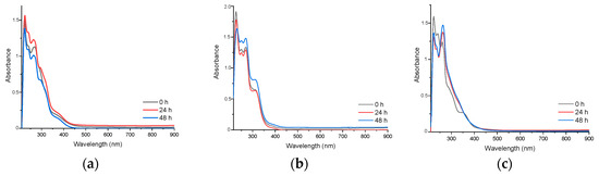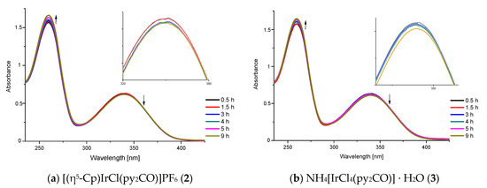 The stability of complexes in solution and lipophilicity play a crucial role in the process of developing a new drug. In our experiment, the UV-Vis and 1H NMR spectroscopies were used over a period of 48 h to monitor the stability of the complexes in a Tris-HCl/NaCl buffer and DMSO, respectively. In the spectra of complex 2 (Figure 6), we observed decreasing intensity of spectral bands, while in spectra of complexes 1, 3 the characteristic bands are slightly red shifted (e.g., 223 →225 nm, 261→263 nm, respectively).