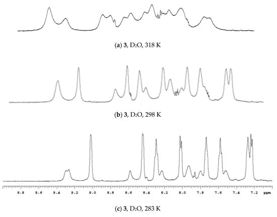 During the coordination reaction, this process of py2CO hydrolysis is favored by metal ions, so in the literature complexes with the gem diol coordinating ligands [9] are presented. For the hydrolysis of the obtained complexes, both the substitution of chloride ions as well as hydration of keto carbonyl group (py2CO) should be taken into consideration. The effective process of hydrolysis of complex 3 is illustrated by 1H and 2D NMR spectra in D2O (Table 6, Figure 8, Figures S8–S10).