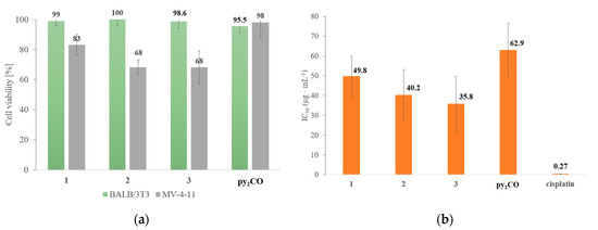 Effect of complexes 1–3 and free py2CO on viability of normal cell line BALB/3T3 and cancer cell line MV-4-11 (a), IC50 values of the analyzed compounds and cisplatin against MV-4-11 (b).
