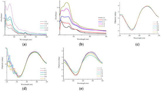 (a,b) UV-Vis spectra of 1, 2 (5 × 10−6 M) in Tris buffer solution with increasing concentration of CT-DNA (0–1.5 × 10−5 M) at room temperature; (c–e): CT-DNA-circular dichroism (CD) spectra (CT-DNA 1.5 × 10−4 M) after 24 h incubation at different [DNA]/[complex] ratios at 37 °C.