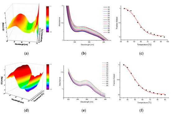Three-dimensional CD melting of CT-DNA (100 μM) in Tris-HCl/NaCl at pH 7.2 with complexes 2 (a–c) and 3 (d–f), 2D absorbance spectra at 256 nm and calculated fraction folded as a function of temperature.