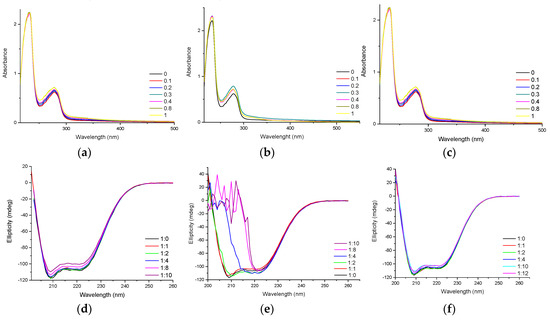 Changes in UV-Vis absorption spectra of HSA (2 × 10−5 M) in Tris-HCl/NaCl buffer upon addition of 1 (a), 2 (b) and 3 (c) in different molar ratio and CD spectra of HSA incubated with 1 (d), 2 (e) and 3 (f) in different molar ratio.
