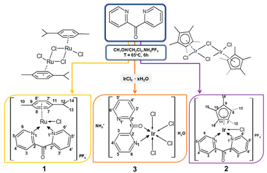 Similar to platinum compounds, ruthenium and iridium complexes have properties such as a variety of oxidation states of their central ions, tuneable redox properties, a wide range of coordination numbers and a structural diversity modulated by coordinating ligands, which have been widely studied [1,2]. Such interesting solid-state materials of transition metal complexes have generated potential applications not only in industrial processes as catalysts, photoelectronic sensors, and luminescent chemosensors (in electronic devices), but also in biological and medicinal contexts. Most studies on the biological characterization of platinum, ruthenium and iridium complexes have found them to be useful in medicinal chemistry, especially for chemotherapy. This is one of the forms of treatment of cancer, which is currently a major public health problem. The first anticancer transition-metal complex drug, cisplatin, which was approved by the U.S. Food and Drug Administration in 1978, is the most widely used drug with antineoplastic activity. However, the oncological use of cisplatin is hindered by its severe side effects (nephrotoxicity, neurotoxicity, ototoxicity and nausea) and a very important resistance problem. Resistance develops mainly due to deactivation of the drug by binding to glutathione (GSH) or other sulfur-containing proteins or an increased ability to repair of DNA lesions [2]. Thus, one of the major challenges is looking for new drugs that possess selectivity. To achieve this, ruthenium and iridium complexes have been widely developed as alternatives to anticancer drugs based on platinum(II) complexes (for example: cisplatin [3], carboplatin, oxaliplatin [4], nedaplatin [5], etc.). We have previously reported [6] that, to overcome this problem, our investigation focused on the synthesis of the ruthenium(II) arene complex, [(η6-p-cymene)RuCl(2,2′-PyBIm)]PF6 (2,2′-PyBIm = 2-(2′-pyridyl)benzimidazole). Such ruthenium complexes with a typical half-sandwich structure are well-suited as chemotherapeutic agents because the process of optimizing their activity against cancer cells involves easy modulation of their arene compounds and/or chelating ligands [7]. Unfortunately, while the obtained complex showed moderate activity against the tested carcinoma cells, it was also active against the normal BALB/3T3 cell line (IC50 = 43.66 µM; but its cytotoxicity is 15 times lower compared with cisplatin) [6]. Taking this into account, during our following experiments, we tested whether a 2-(2′-pyridyl)benzimidazole replacement with 2,2-bis(4,5-dimethylimidazole) (L1) in an arene ruthenium complex {[RuCl(L1)(η6-p-cymene)]PF6}·2H2O [8] could be a potential chemotherapeutic agent. It displays only moderately cytotoxic activity against the MV-4-11 cell line (IC50 = 27.34 µM) in vitro but does not affect the normal BALB/3T3 cell line. This points to the selectivity of the obtained complex. These results motivate our additional investigations. In this paper, we present the synthesis and characterization of not only a new ruthenium(II) arene complex [[(η6-p-cymene)RuCl(py2CO)]PF6 (1)], but we also extend our studies on the iridium(III) complexes [[(η5-Cp)IrCl(py2CO)]PF6 (2) (Cp-pentamethylcyclopentadienyl) and NH4[IrCl4(py2CO)]·H2O (3)]. Taking into consideration that not only the metal but also the ligands play important roles in their biological activity, we paid special attention to choose a proper chelator possessing N and/or O-donor atoms. We selected for this purpose di-2-pyridylketone (py2CO). It should be mentioned that neutral py2CO has three potential donor groups, the two 2-pyridyl nitrogen atoms and the carbonyl oxygen atom. In respect to this, this ligand adopts a variety of coordination modes—for example, monodentate (κN), chelating (κ2N,N’ or κ2N,O), and bridging and chelating (μ2-κ2N,O:κ2O,N’) (Scheme 1a–d) [9]. Moreover, in the presence of water, the ketone carbonyl group can undergo nucleophilic substitution, forming a gem-diol (see Scheme 1e).