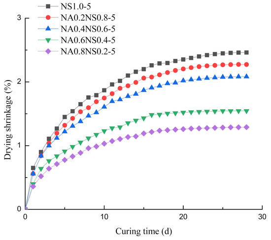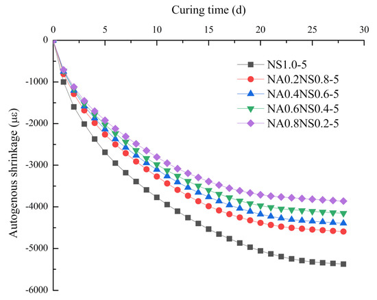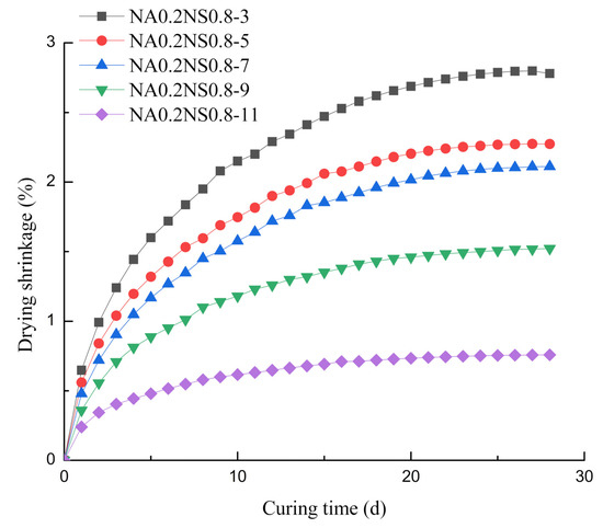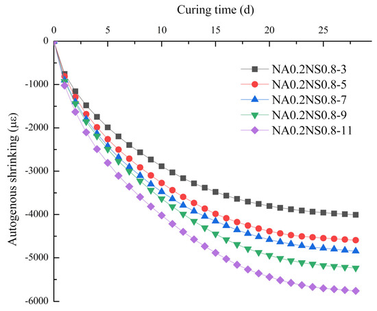 Figure 4 plots the effects of different Na2O contents on autogenous shrinkage at fixed 20% NaAlO2 substitution rates. By elevating the Na2O content, the autogenous shrinkage increased, consistent with the Ma et al. [27] found. However, the results were contrary to the drying shrinkage test results. The autogenous shrinkage happened without the exchange of external substances and the water from paste was not migrated. Hence, high Na2O content promoted completed the hydration reaction of the paste, which in turn caused greater autogenous shrinkage [28]. The maximum autogenous shrinkage group (NA0.2NS0.8-11) was 1.4 times and 1.5 times that of the minimum autogenous shrinkage group (NA0.2NS0.8-3) at 7 d and 28 d, respectively. Then, the phenomenon of autogenous shrinkage with different Na2O contents would be consistent with the degree of hydration reaction. Neto et al. [23] also believed that drying shrinkage due to the water evaporation from the paste was more significant than autogenous shrinking.