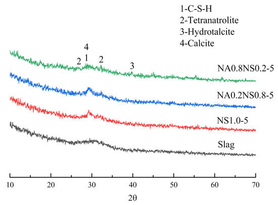 The composition of the hydration products was analyzed by XRD. The generation of different hydration products had significant impacts on the pore structure and shrinkage properties. By checking the results of drying shrinkage and autogenous shrinkage, we found that drying shrinkage and autogenous shrinkage before 7 d were more severe than that of after 7 d. Therefore, the characteristics of hydration products at 7 d could explain the different shrinkage changes. Figure 5 shows the XRD image of raw slag and different NaAlO2 substitution rates at 7 d. The characteristic phenomenon at approximately 30° of all AAS was a feature corresponding to big quantity of amorphous products which were C-(A)-S–H gels [29]. Calcite was found in all pastes and was generated by sample carbonization during preparation and curing time [30]. However, hydrotalcite and tetranatrolite were also major products found in this research. Hydrotalcite had micro-expansion in a certain degree; tetranatrolite was a zeolite phase structure, which was beneficial to mitigate paste shrinkage [31]. At the same time, as the substitution rate of NaAlO2 increased, the amount of hydrotalcite and tetranatrolite also increased, which generated different shrinkage mitigation effects among all the AAS—and was consistent with the results of the drying shrinkage test.