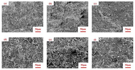Microscopic structure of AAS with different NaAlO2 substitution rates at 7 d and 28 d. (a) NS1.0-5 at 7 d; (b) NA0.2NS0.8-5 at 7 d; (c) NA0.8NS0.2-5 at 7 d; (d) NS1.0-5 at 28 d; (e) NA0.2-NS0.8-5 at 28 d; (f) NA0.8NS0.2-5 at 28 d.