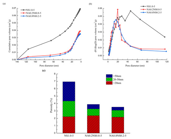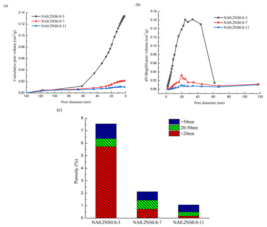 Pore-size distribution of AAS with different NaAlO2 substitution rates. (a) Cumulative intrusion; (b) different intrusion; (c) porosity.