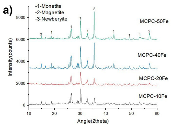 The XRD phase analyses in Figure 1a show the prominent diffraction peaks of two major phases: monetite (PDF# 97-000-0918) and magnetite (PDF#97-003-156). In lower concentrations of magnetite, i.e., in MCPC-10 and MCPC-20Fe compositions, the diffraction peaks of monetite are high, but with a higher incorporation content of magnetite (MCPC-40Fe and MCPC-50Fe), the diffraction intensity of the peaks corresponding to magnetite is significantly higher than for monetite. Furthermore, the well-defined nature of the peaks indicates the crystalline nature of both phases. Newberyite (Mg(HPO4).3H2O, PDF #97-003-1281) is also seen as being present in minute quantities in all the compositions due to usage of Mg(OH)2 while preparing the cement.