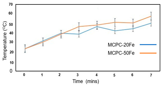 Figure 2 shows the heat generation profile of the MCPC compositions over 7 min. At the onset of the application of the electromagnetic field, the initial temperatures for both the cement compositions gradually increase. Please note that the heat generated by MCPC-10Fe is very similar to MCPC-20Fe and that the heat generated by MCPC-40Fe is very similar to MCPC-50Fe. In order to draw a better comparison and note the difference, we chose to present the results of MCPC-20Fe and MCPC-50Fe. During the first 2 min, no notable difference in heat generation is observed between MCPC-20Fe and MCPC-50Fe. Interestingly, after 2 min, the temperature of the MCPC-20Fe drops noticeably over a minute before rising back again. This pattern is also repeated at the 4th minute. On the contrary, the heat generated by MCPC-50Fe consistently increases over time and reaches a maximum of 55 °C, which might be harmful to healthy cells. Conversely, despite a non-uniform heat generation profile in the case of MCPC-20Fe, the localized temperature lies in the range of 40–45 °C, which is enough to kill the tumor cells without destroying healthy cells [22,23]. In a recent study, Yan et al. confirmed that the temperature range of 43−45 °C was sufficient to kill tumor cells while having a less damaging effect on stem cells [8]. In another study, 0.36 g of 10 wt.% magnetite-incorporated CPC compositions generated a temperature of approximately 46 °C and successfully ablated 1.96 ± 0.19 cm3 of tumors [7]. Heat is generated due to the excitation and random movement of the magnetite particles under the application of an electromagnetic field. The extent of heat generation can be controlled by varying the amount of incorporated magnetic component and/or by configuring the parameters of the applied electromagnetic field. In this study, we varied the amount of magnetic component to optimize the heat generation. The result indicates that the MCPC-20Fe composition is capable of generating an optimized heat for the hyperthermia treatment of bone tumors.