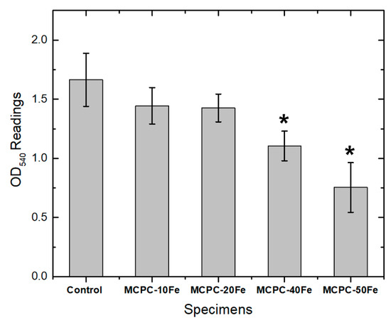 For the cytocompatibility analyses of the specimens, model osteoblastic cell line–mouse calvarial pre-osteoblasts designated as MC3T3-E1 (ATCC CRL-2593, Manassas, VA, USA) were used. Specimens were autoclaved and cooled down to room temperature before every assay. All the assays were performed after the specimens were completely set (after the final setting time). Approximately 2.3 × 104 cells were seeded directly on different MCPC specimens and cultured in complete MEM-α at 37 °C with 5% CO2 flow for seven days. Wells with no samples and only cells served as controls. At that specific time frame, well plates were retrieved from the incubator and treated with 500 µL thiazolyl blue tetrazolium bromide (MTT, Sigma-Aldrich, St. Louis, MO, USA) for 4 h at 37 °C with 5% CO2 flow. After 4 h, dimethyl sulfoxide (DMSO, Sigma Aldrich, St. Louis, MO, USA) was used to dissolve the formazan during a short 10 min incubation. Subsequently, OD540 readings were recorded by spectrophotometer and compared.