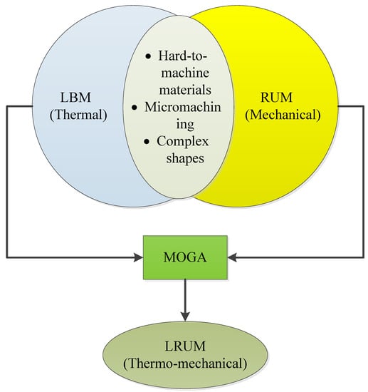 Unification of laser beam machining (LBM), rotary ultrasonic machining (RUM), and laser rotary ultrasonic machining (LRUM) processes.