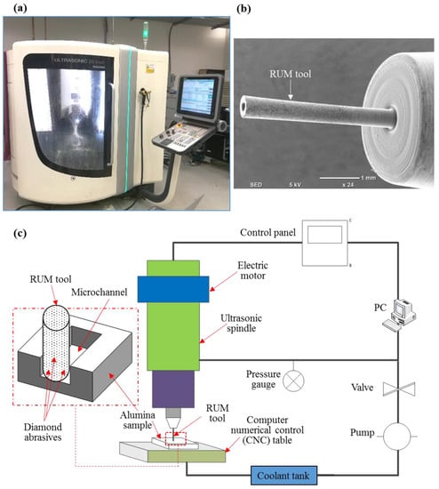 (a) Ultrasonic 20 Linear machine, (b) MicroRUM tool; (c) Schematic diagram of RUM.