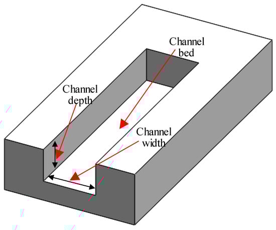 Microchannels were produced in five varying sizes and two kinds of the cross-sectional area comprising square and rectangular cross-sections. Table 2 enumerates the dimensions of the desired channel sizes. The channel sizes were chosen depending on the requirements of microfluidics as stated in [51,52,53]. The microchannel schematic can be seen in Figure 4.