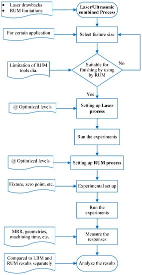 Before the final experiments were implemented, the selection of the laser and RUM key input parameters was essential. In this analysis, the process parameter ranges were specified based on previous studies of laser machining [45,47,54,55,56,57] and RUM [58,59,60,61,62]. The preliminary experiments were also conducted to establish the exact levels of the process parameters which were later used for the final experiments. Table 3 demonstrates the parameters of LBM, RUM input factors, and their levels used in the experiments. The entire workflow is described in Figure 5.