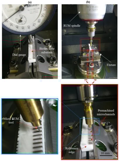 It should be emphasized that the method of machining using RUM in the premachined microfeatures was challenging due to the accompanying reasons. For example, the placing of the microRUM tool in the center of the premachined microchannel, the machine’s positioning accuracy, and the precision of the fixtures used. To resolve the above difficulties, the dial guage was used to establish the leveling of the workpiece, as shown in Figure 6a. In addition, one edge in Figure 6a of the workpiece that is the reference edge was chosen as the reference to direct the tool to the center of premachined microchannels as illustrated in Figure 6b. The workpiece measurements were determined automatically using a contact probe tool with a positioning error of ±2.5 μm. Additionally, the RUM microtools length and diameter were calculated and recalibrated using the integrated DMG laser tool length calibration method.